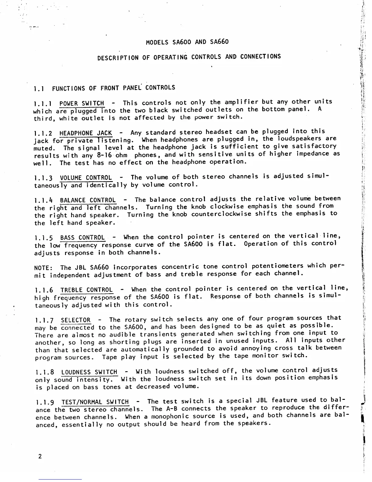 JBL SA600 - Description of Operating Controls and Connections; Functions of Front Panel Controls; Power Switch; Headphone Jack