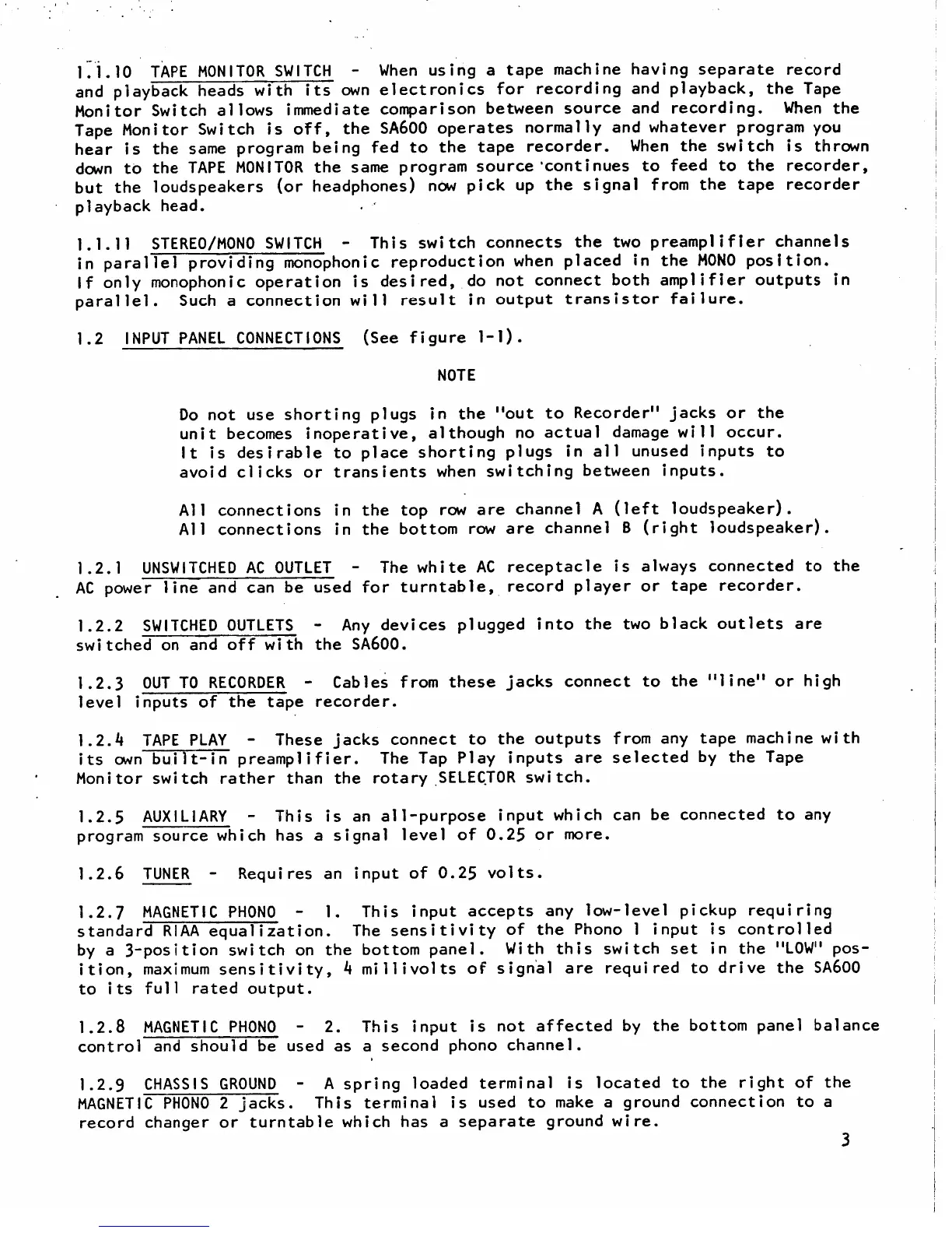 JBL SA600 - Tape Monitor Switch; Stereo;Mono Switch; Input Panel Connections; Tape Play