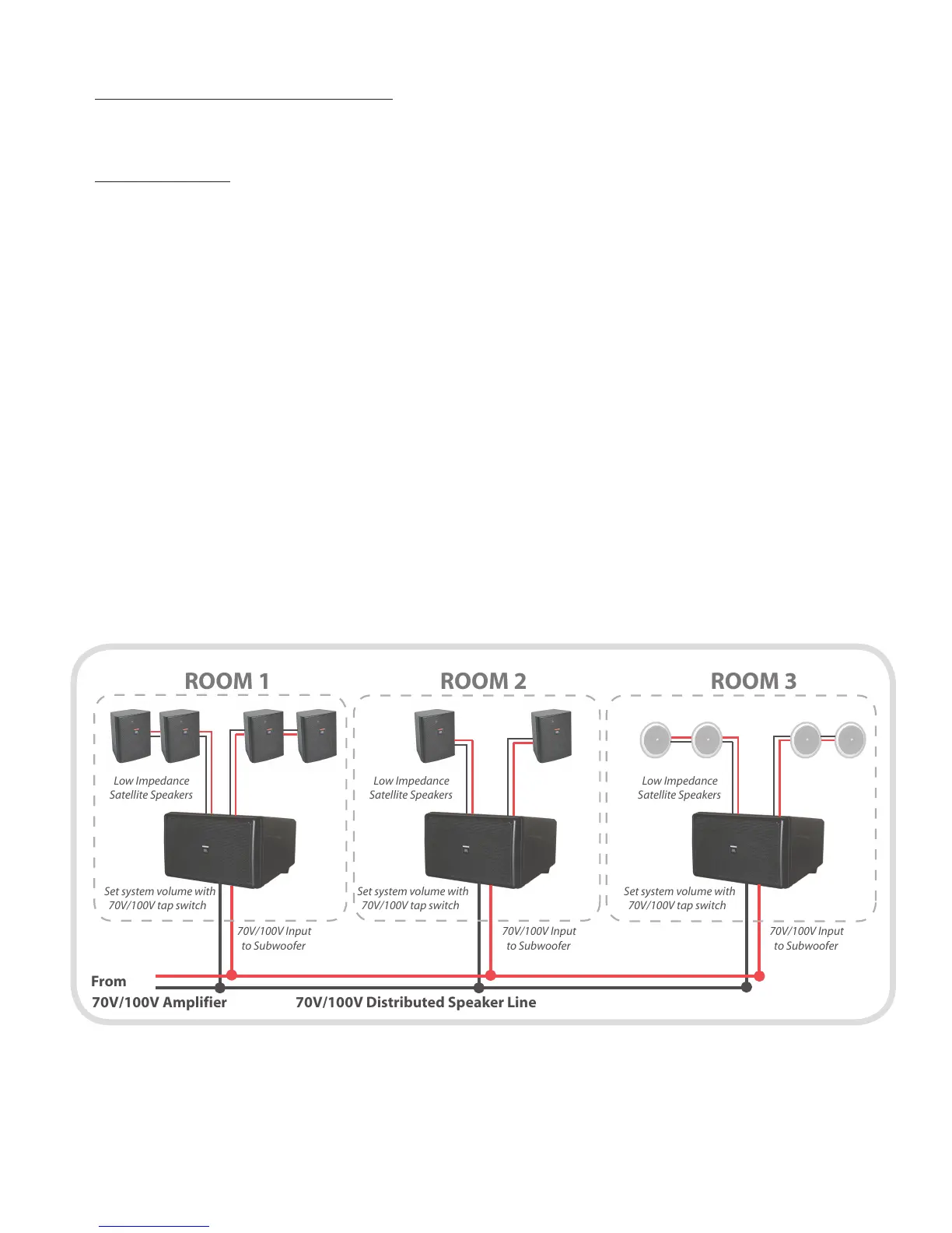 Multiple 70V/100V sub-sat systems on a single distributed speaker line.