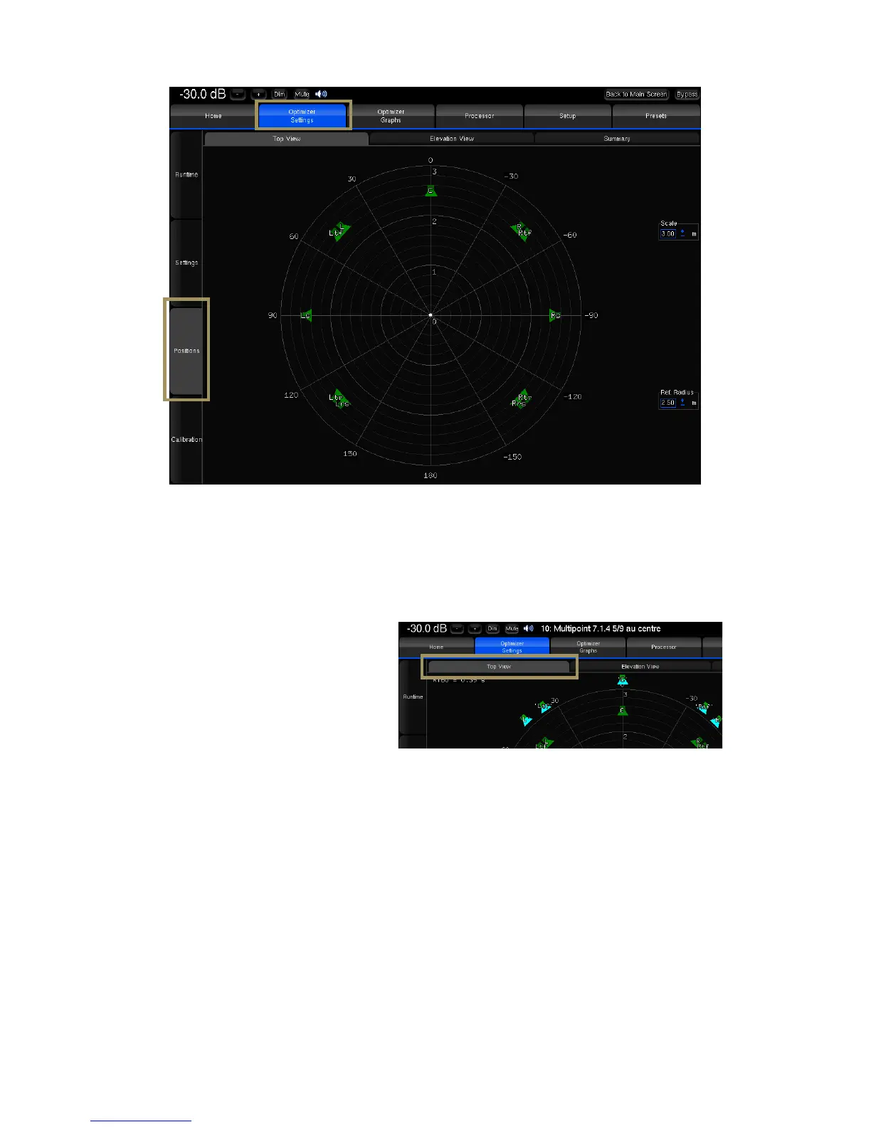 • The Elevation View uses the same color codes to display the real speaker positions. It indicates whether the