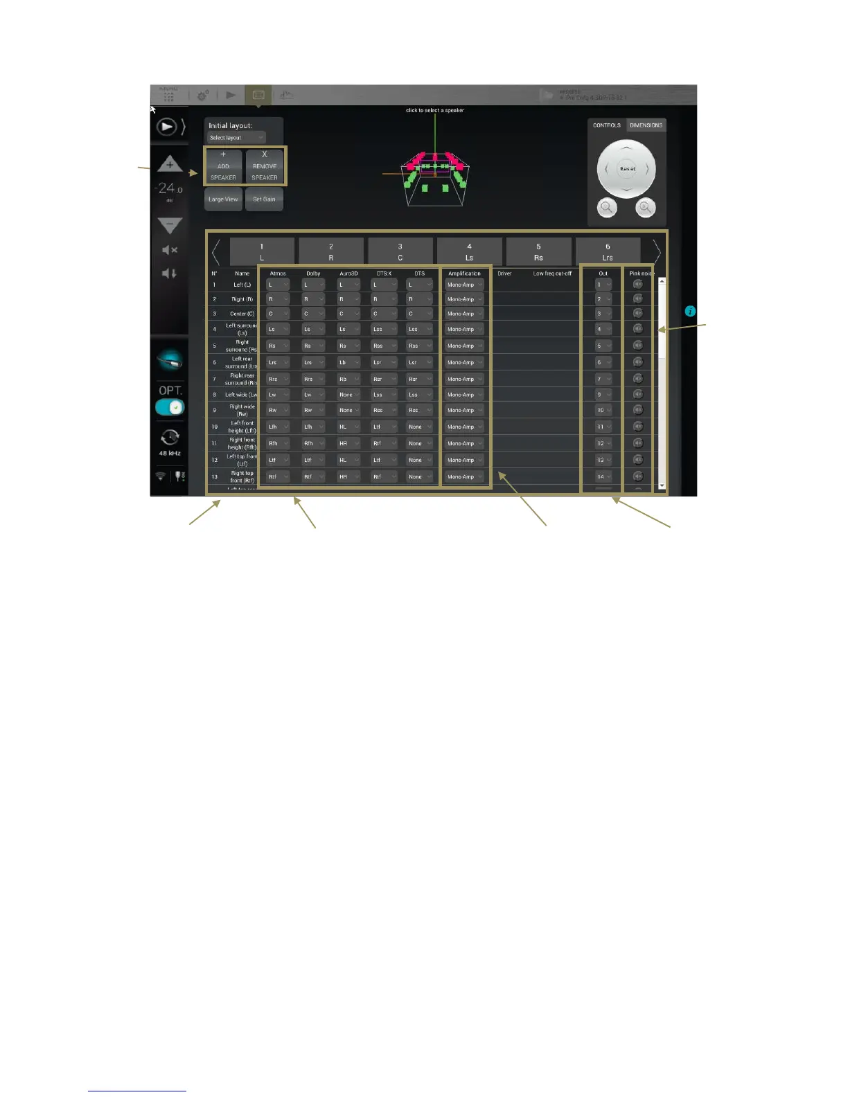 The currently selected speaker is displayed in yellow in the 3D view.