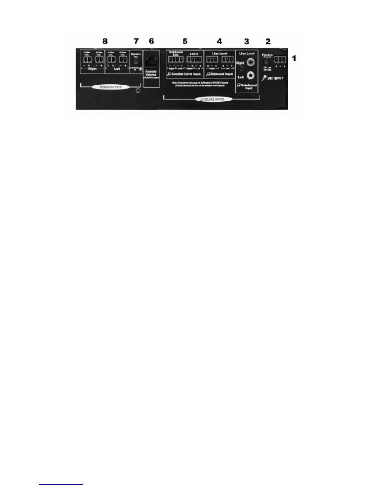 connect a source to this Input if using either the Balanced Input (4) or the Speaker Level Input (5).