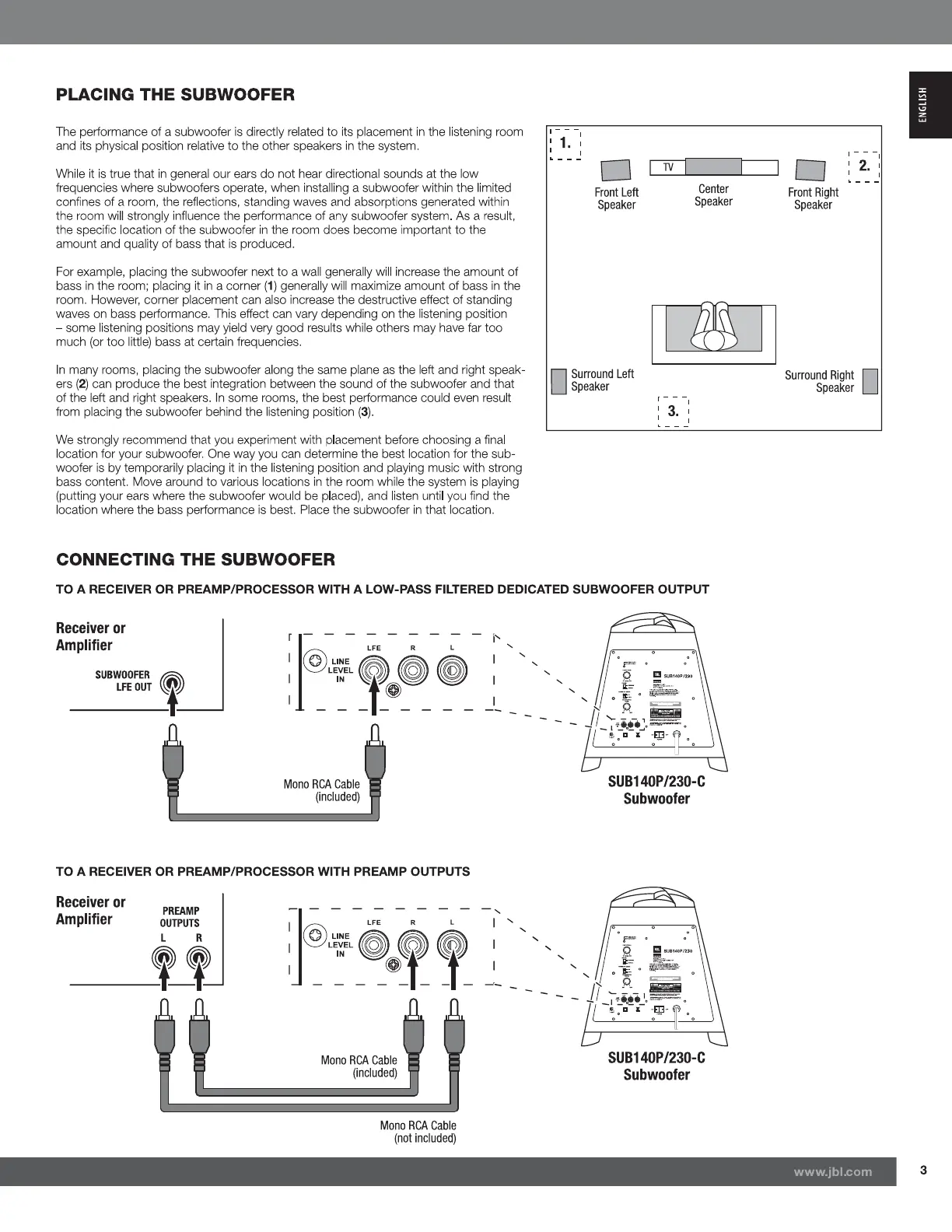 JBL SUB 140P/230 - Subwoofer Placement; Optimal Subwoofer Placement Guide; Subwoofer Connection Methods; Connecting to Dedicated Subwoofer Output