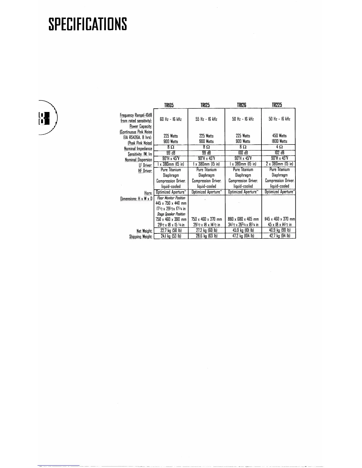 JBL TR SEries - Technical Specifications