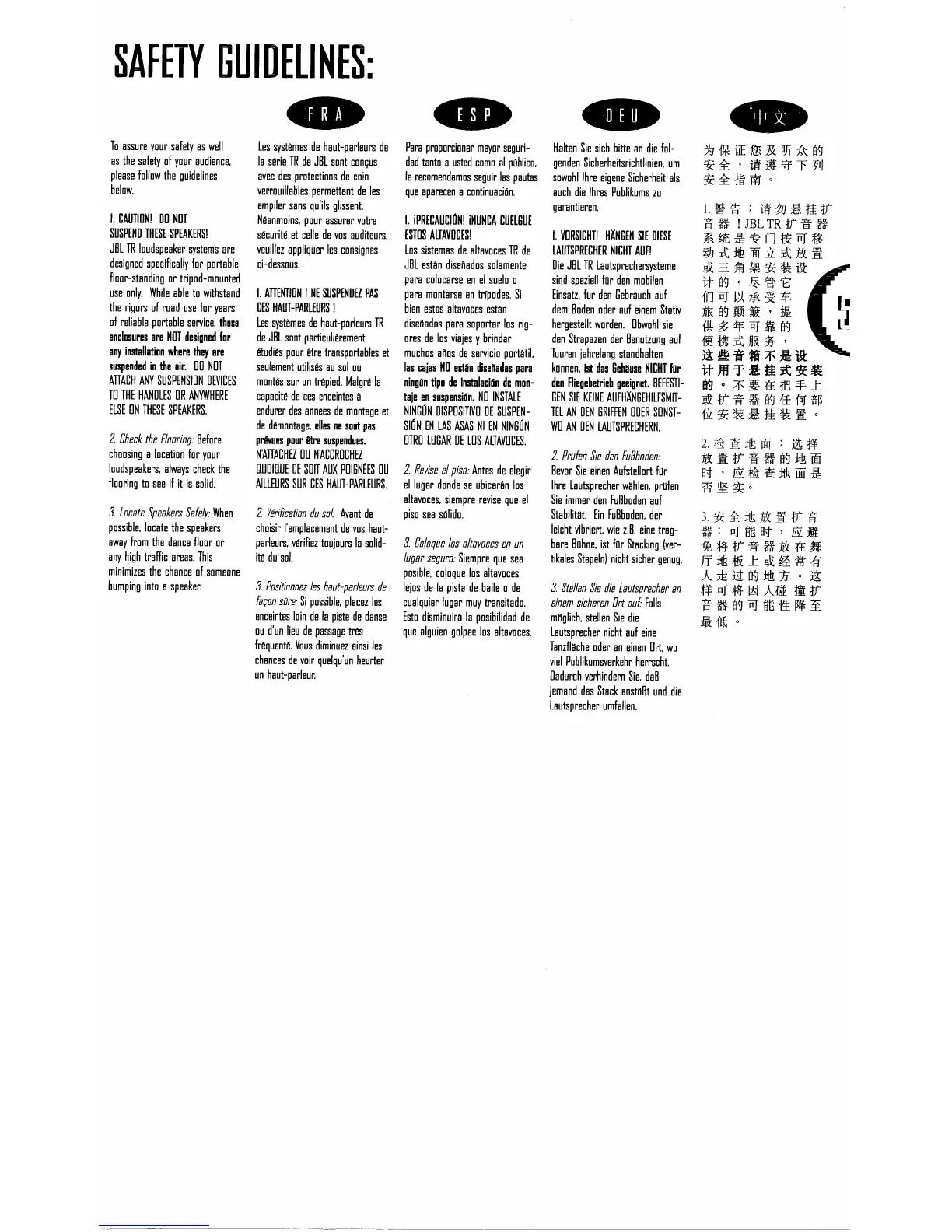 JBL TR SEries - Safety Guidelines for Speaker Use; Critical Safety: Speaker Suspension and Placement