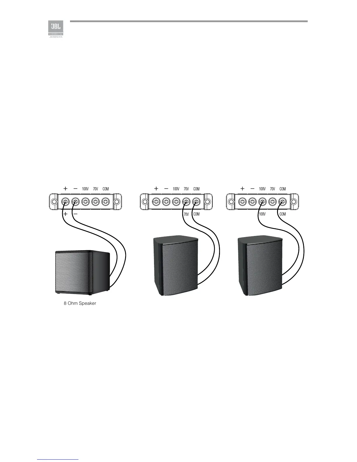 To drive distributed speaker systems designed to operate at 70V or 100V, connect to