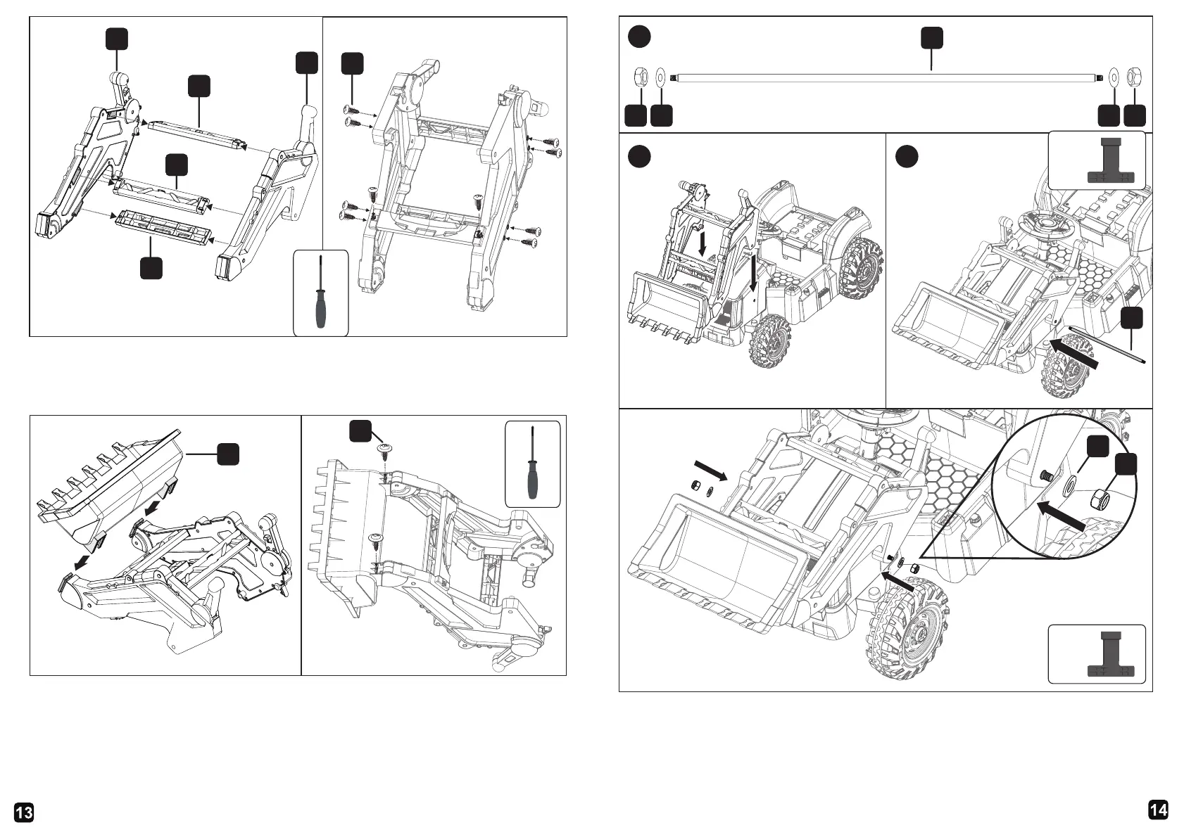 3.Pass M (bucket fixed axle) through bucket frame and front head.