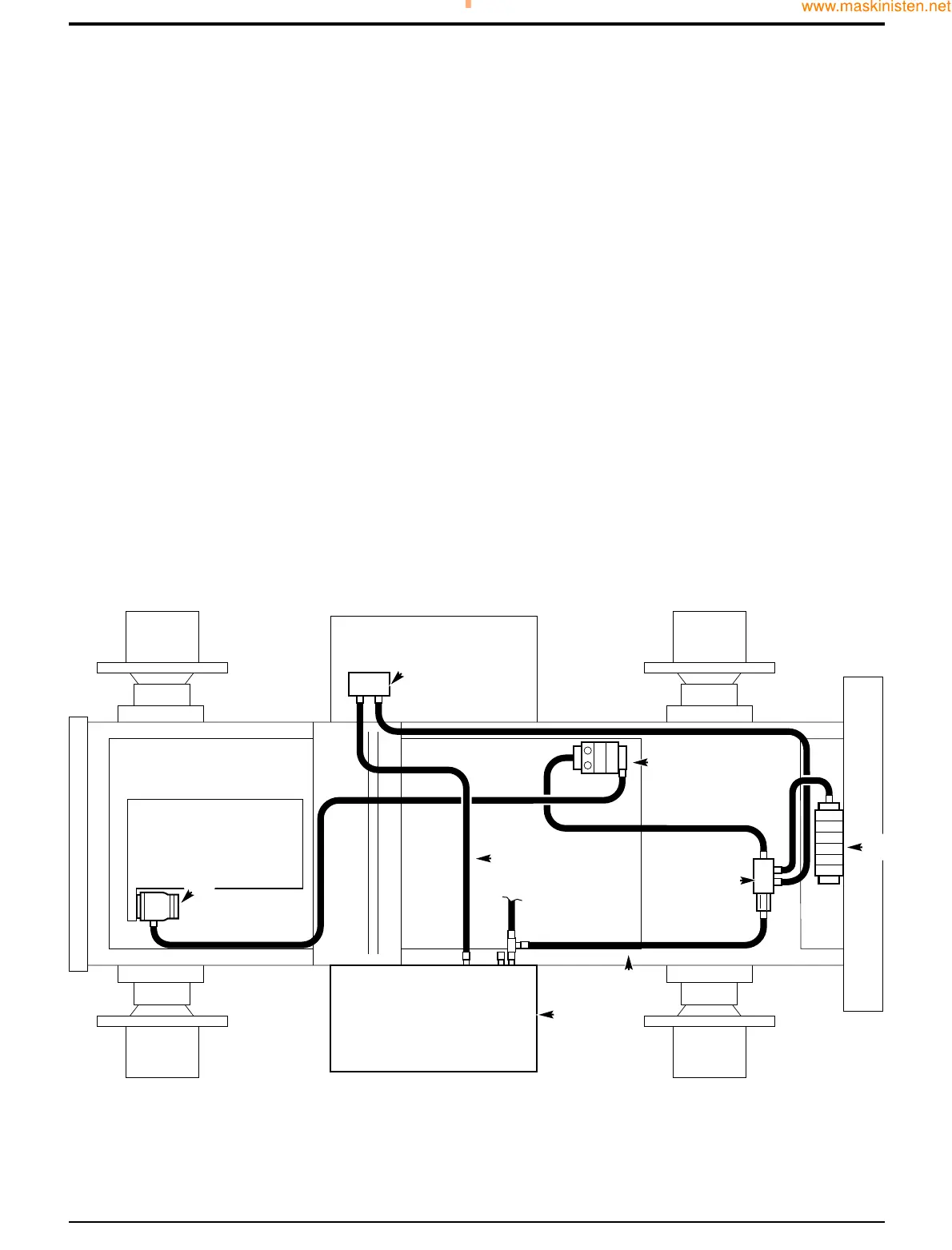 Oil from the hydraulic pump 2 enters the loader valve 3 (brake and steer circuits not shown). From the loader valve, the oil