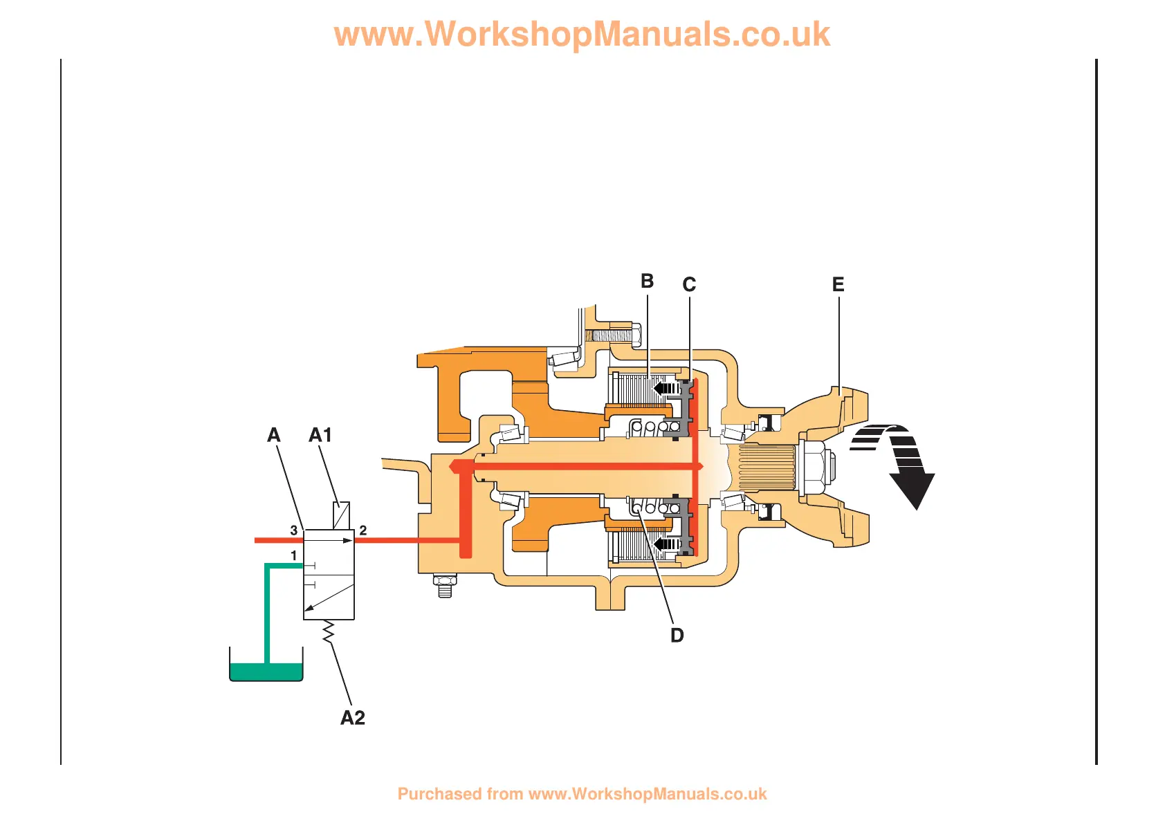 Pressurised oil is directed to piston C via ports 3