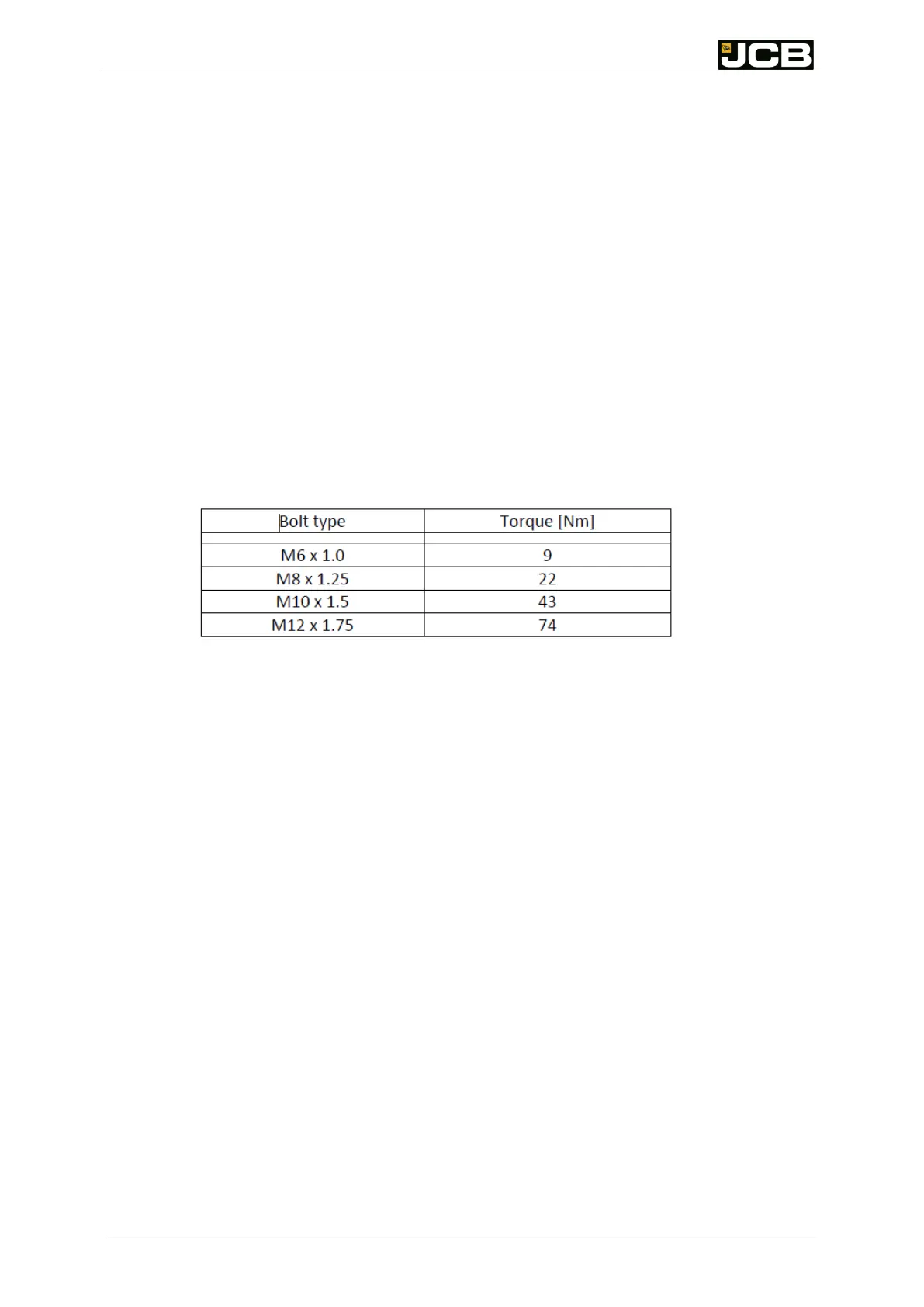 JCB recommend that the Design office of the OEM verify the required tightening torque by completing