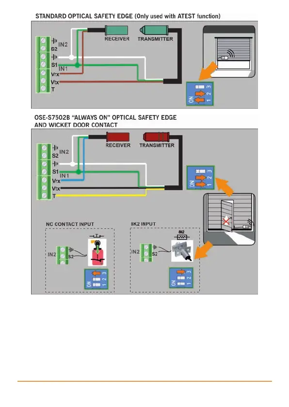 jcm-tech RB3 T868 - Diverse Transmitter Input Connection Types; Standard Optical Edge & Wicket Door Contact; NC Contact and 8 k2 Input Connections