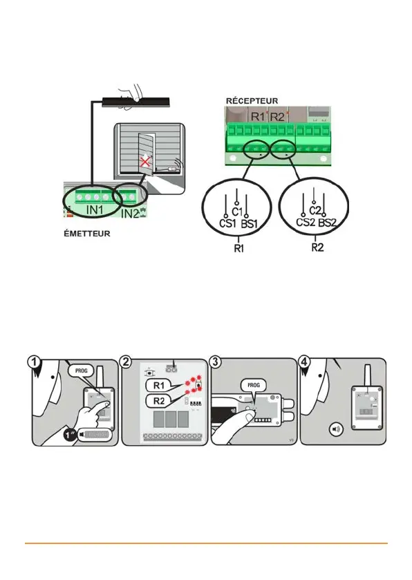 •Appuyer sur le bouton PROG du récepteur (1) jusqu’à ce que la R1 et R2 clignotent