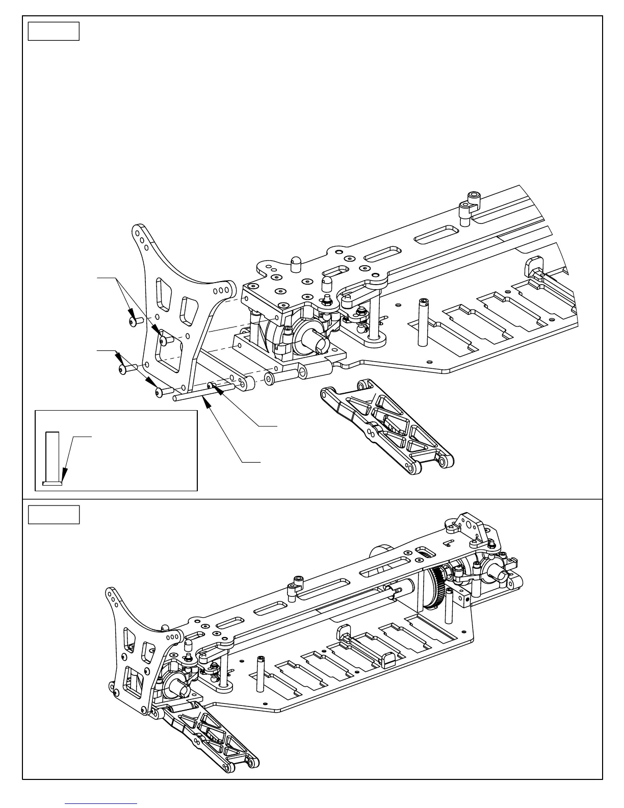 5. ATTACH THE FRONT SHOCK TOWER USING TWO 4-40 x 3/8" BUTTON HEAD SCREWS AT THE BOTTOM AND TWO