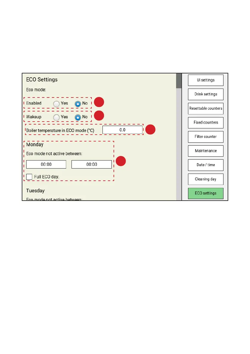a user to interupt ECO mode when necessary to make a drink), set ECO mode boiler temperature (C), and set