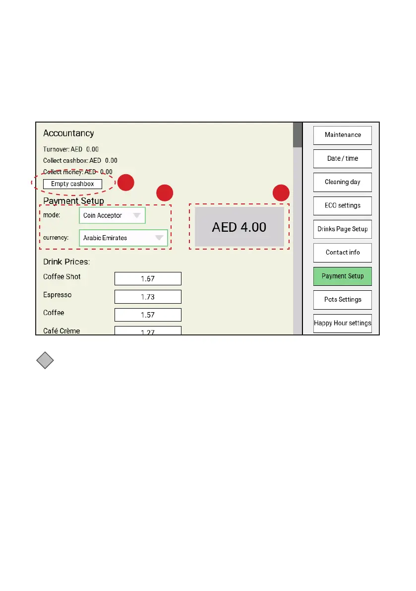 In the Payment Setup menu you can read the cash turnover, check the amount in the cash-box, read the
