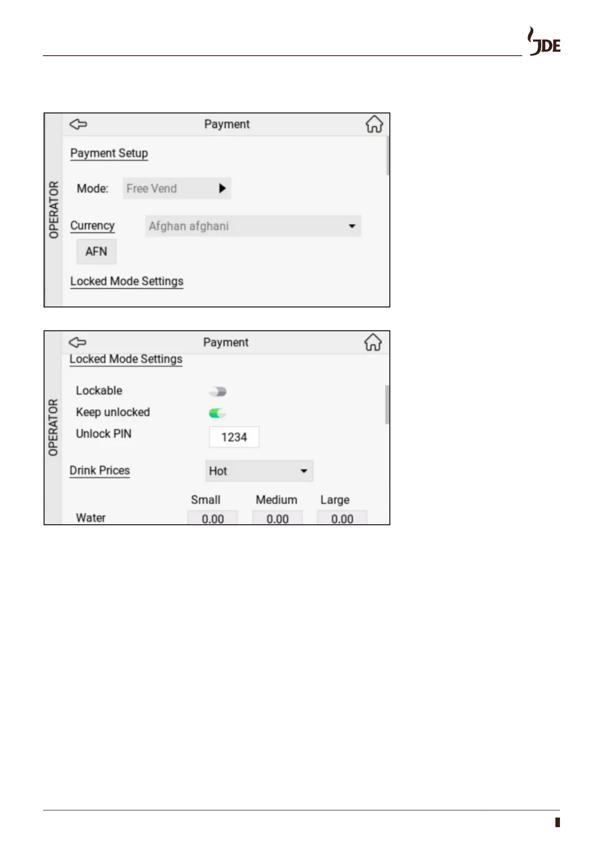In the Payment menu you can select the payment mode, select the currency and set drink prices.