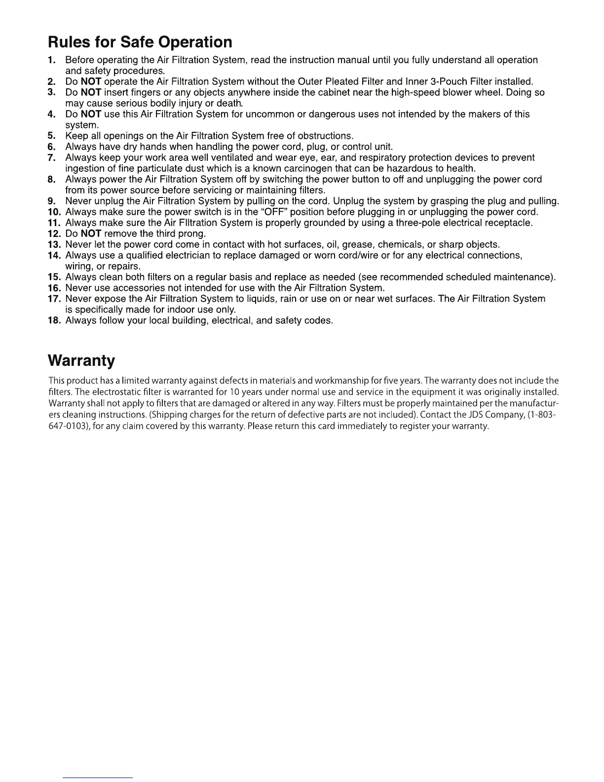 JDS AIR-TECH HP - Rules for Safe Operation; Warranty