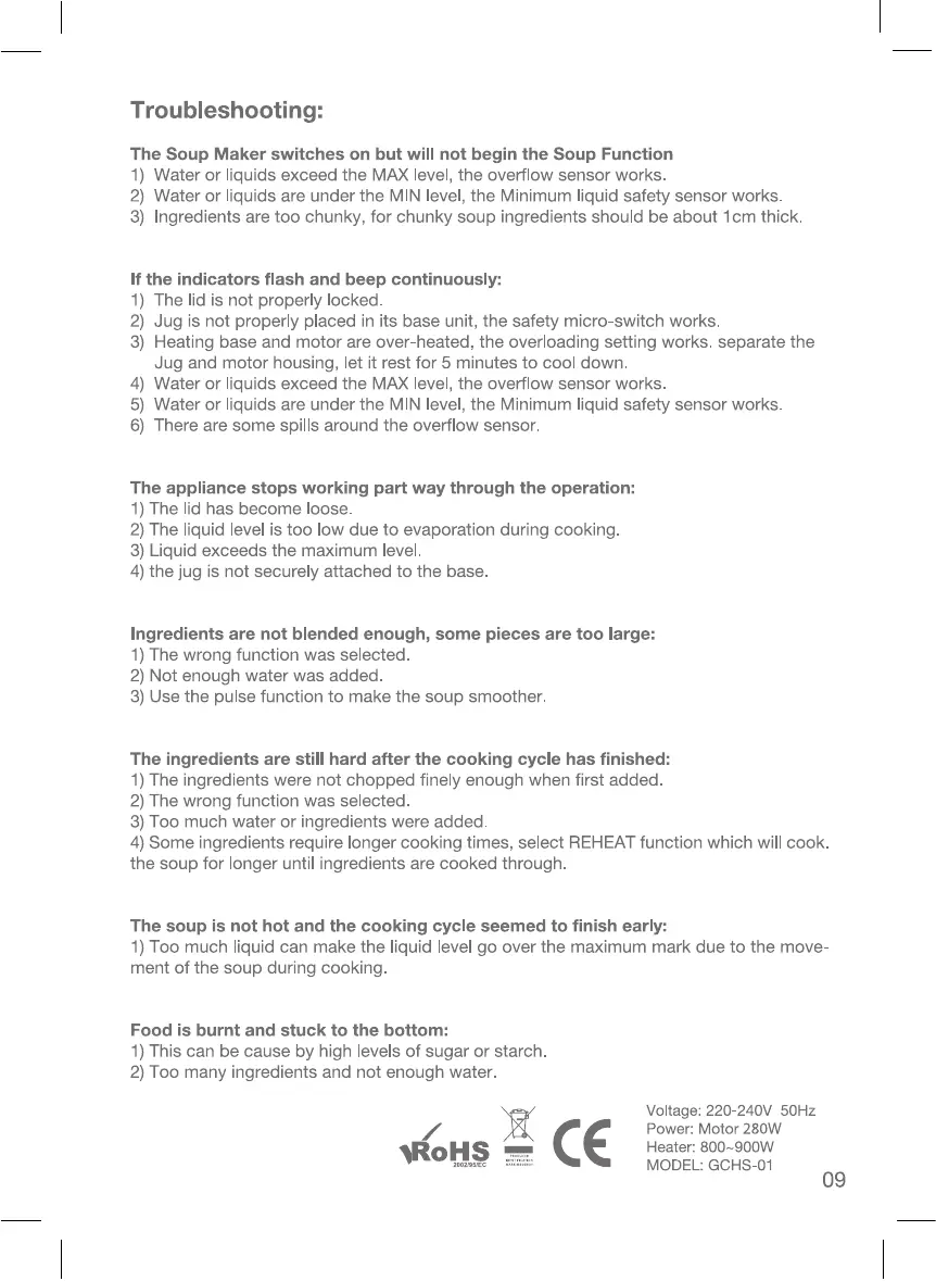 JDW GCHS-01 - Troubleshooting; Soup Function Not Starting; Indicators Flash and Beep Continuously; Appliance Stops Mid-Operation
