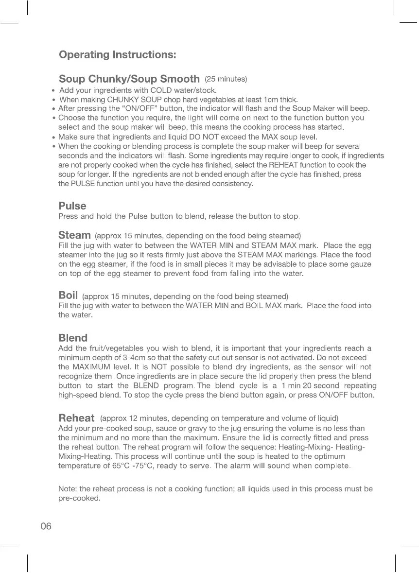 JDW GCHS-01 - Operating Instructions; Soup Chunky;Soup Smooth; Pulse; Steam