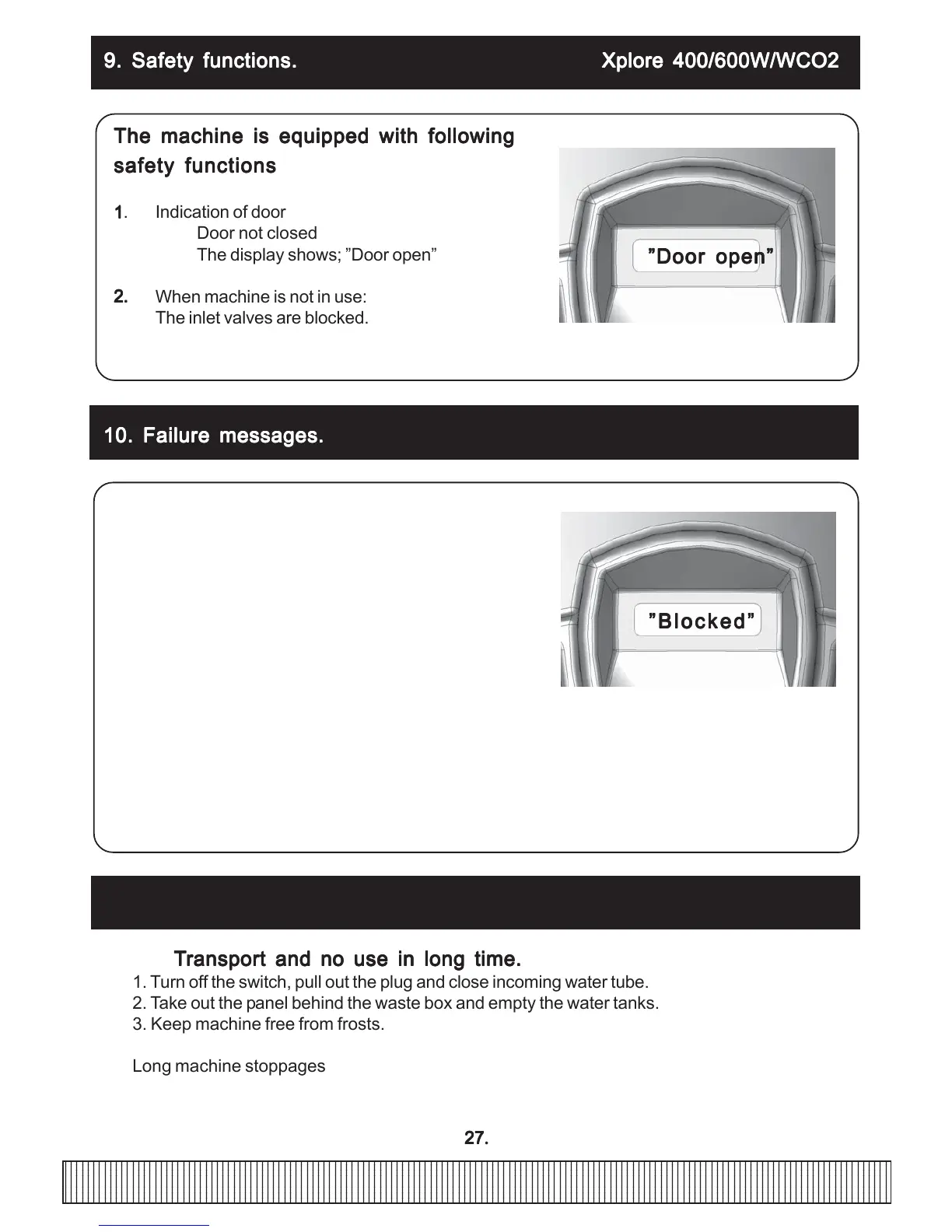 1. The display shows; ” Blocked” ”Water level low”