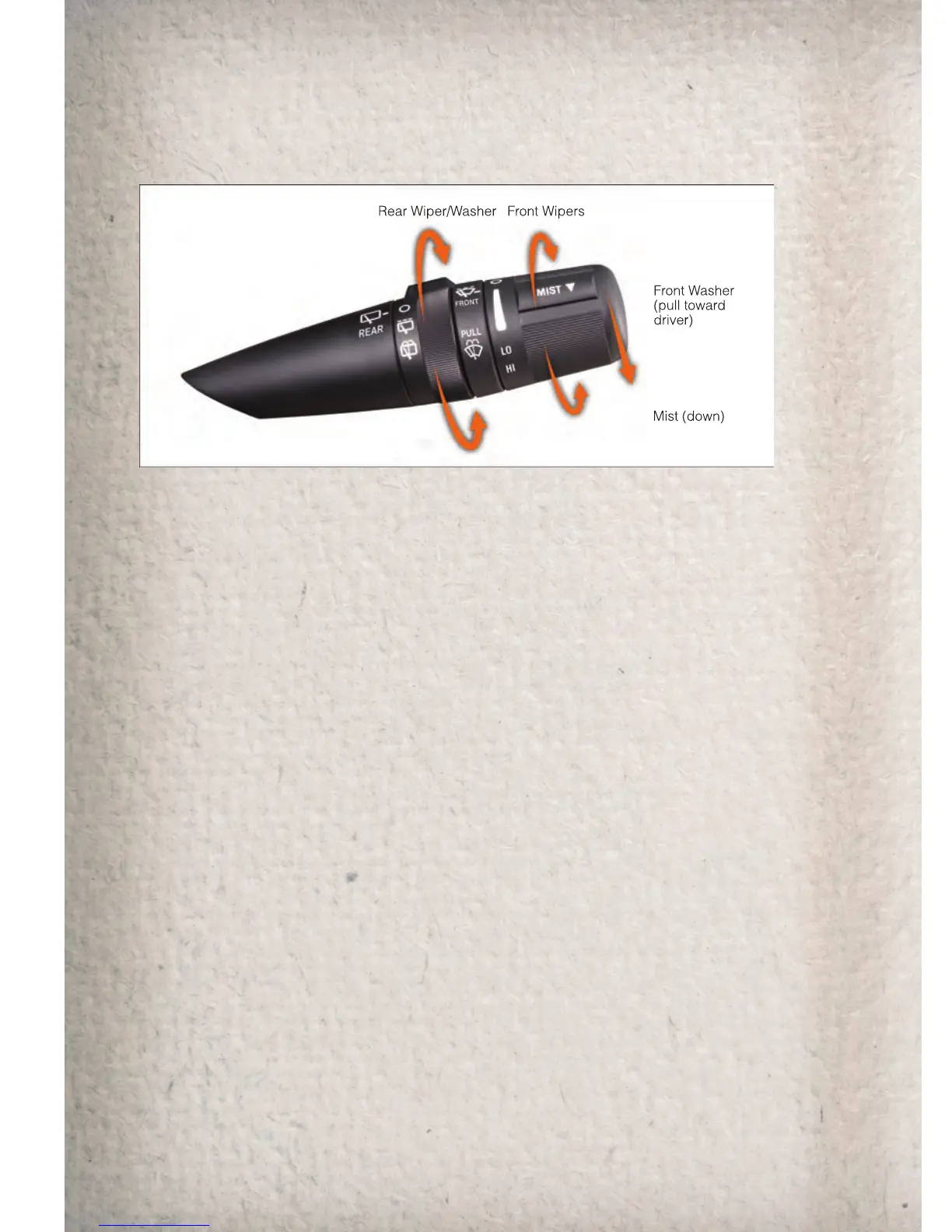 • Rotate the center portion of the lever past the first detent to activate the rear washer.