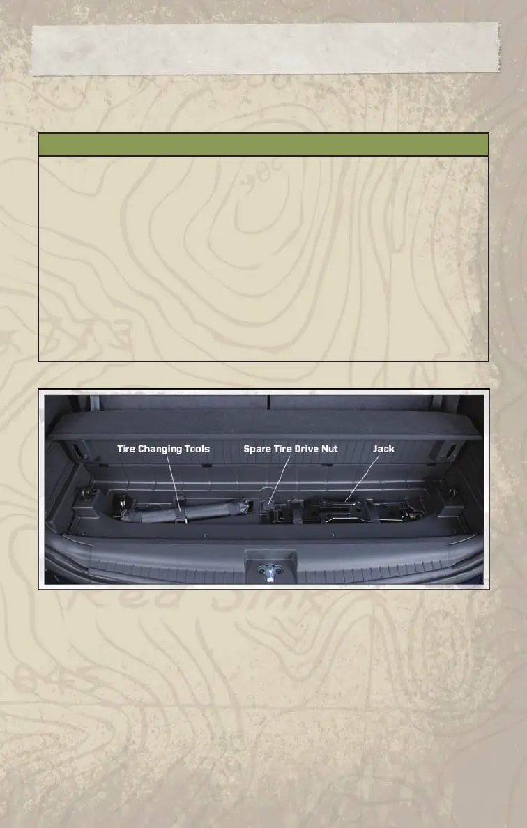 • The scissor-type jack and tire changing tools are located in a compartment behind the