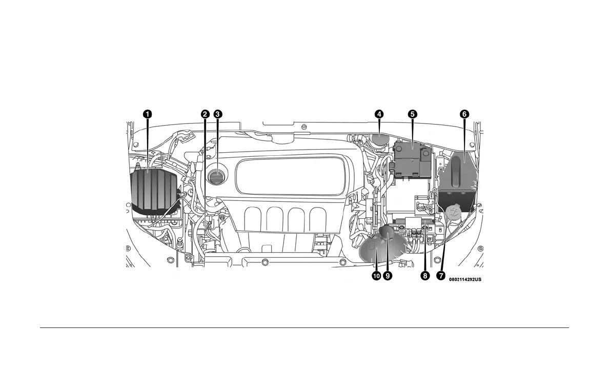 2 Engine Oil Dipstick 6 Power Distribution Center (Fuses) 10 Engine Coolant Reservoir
