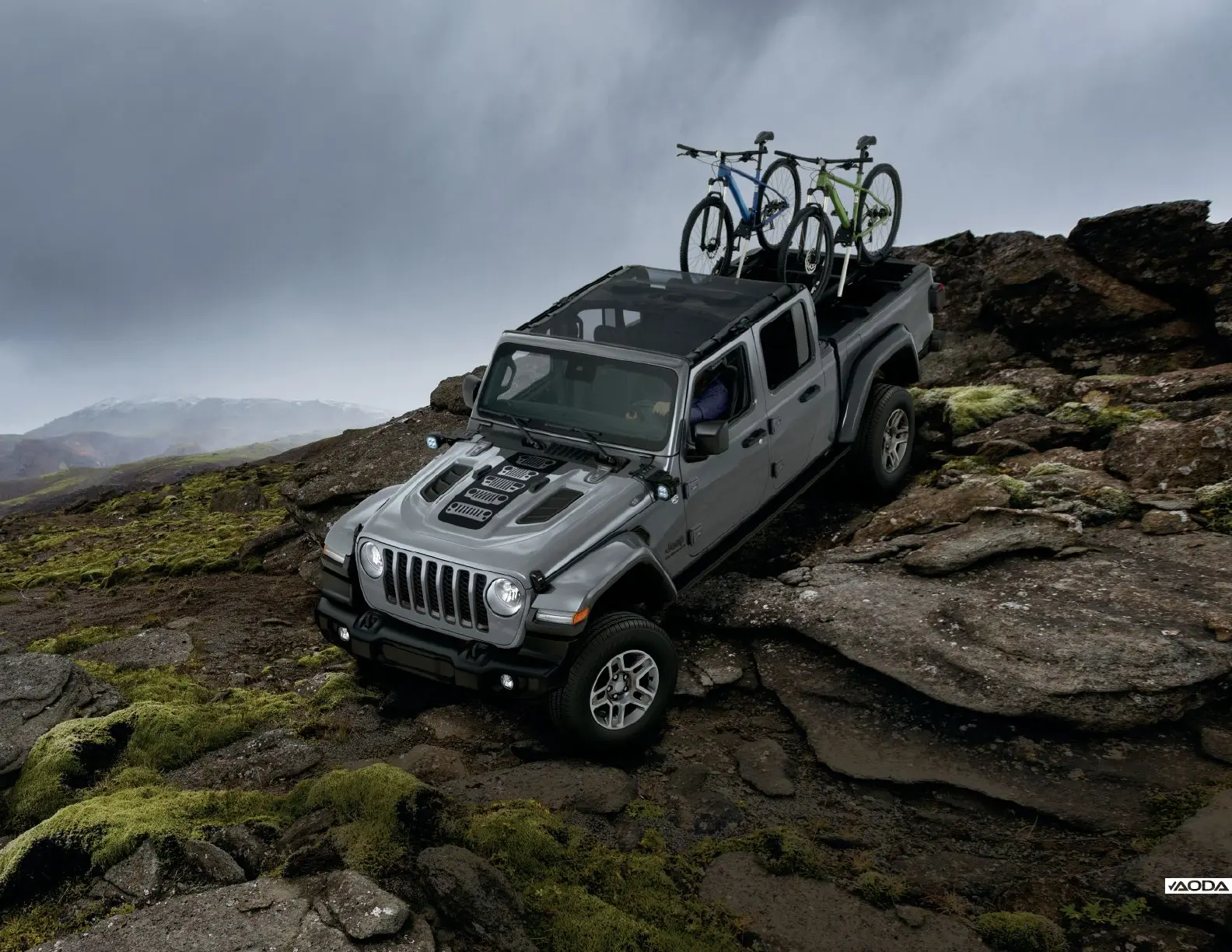 GLADIATOR SPORT IN STING-GRAY FEATURES RUBICON® HOOD PACKAGE, HERITAGE GRILLE HOOD GRAPHIC, 5-INCH LED OFF-ROAD