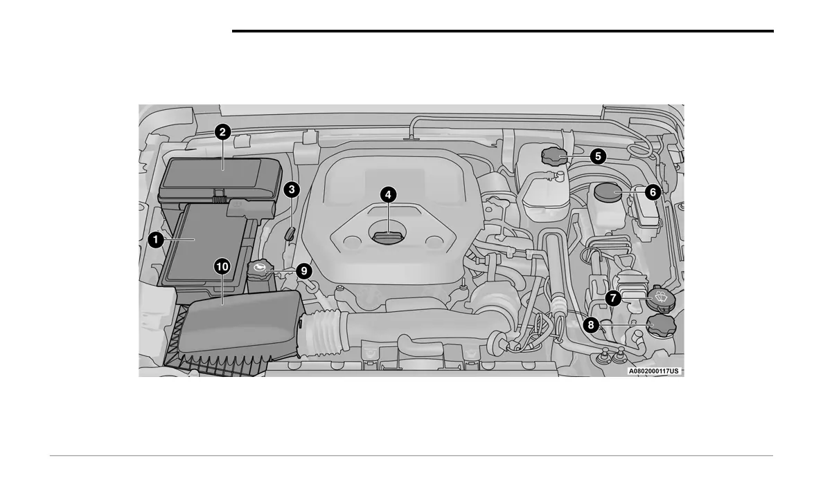 2 — Power Distribution Center (Fuses) 7 — Washer Fluid Reservoir Cap