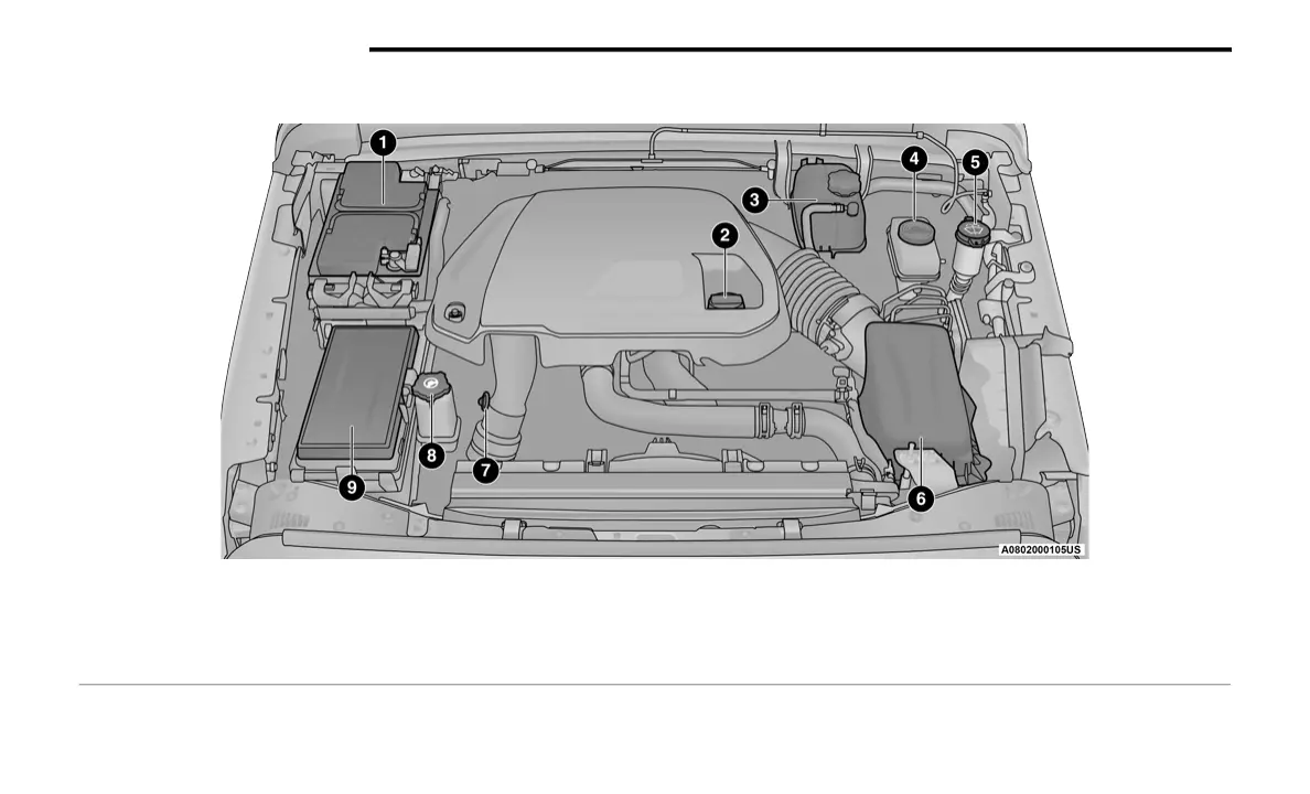 3 — Engine Coolant Pressure Reservoir 8 — Power Steering Reservoir Cap