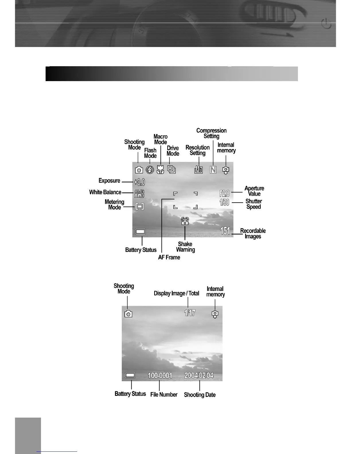 camera settings, remaining image capacity and shooting date.