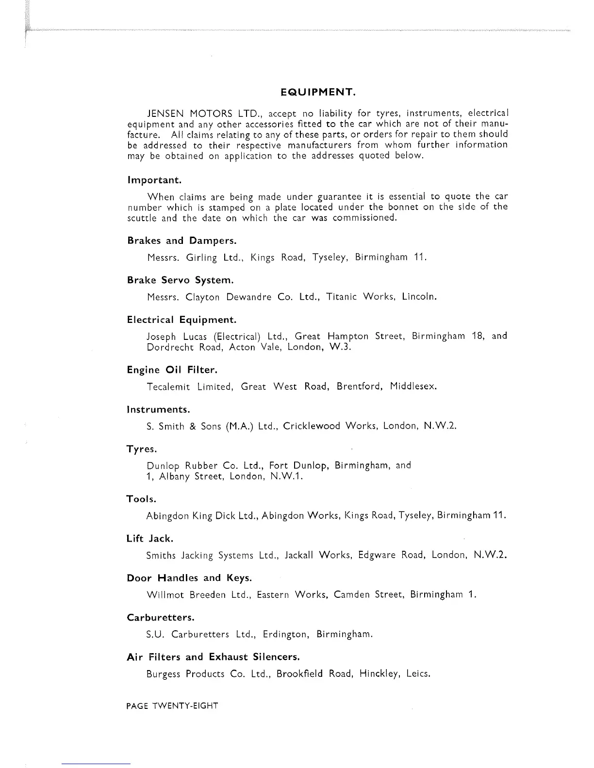 JENSEN MOTORS LTD., accept no liability for tyres, instruments, electrical