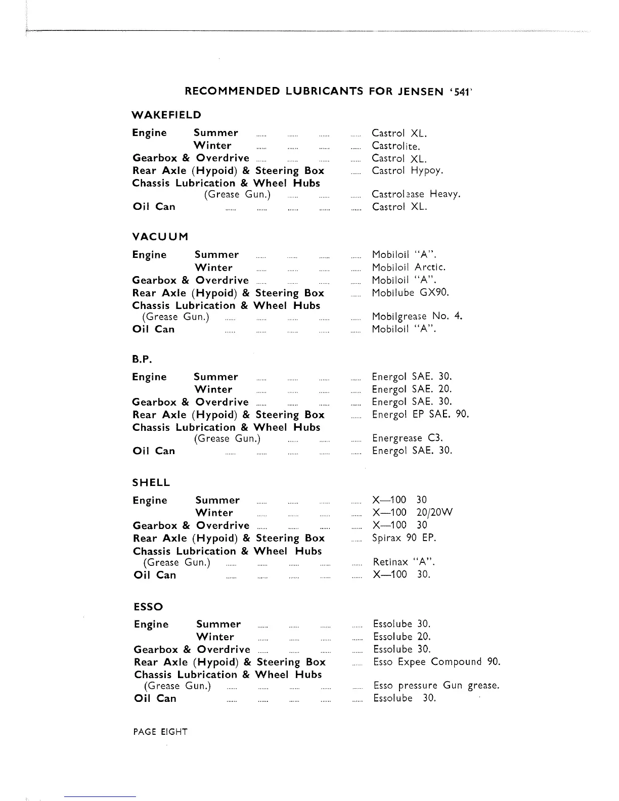 Jensen 541 - Recommended Lubricants for Jensen 541