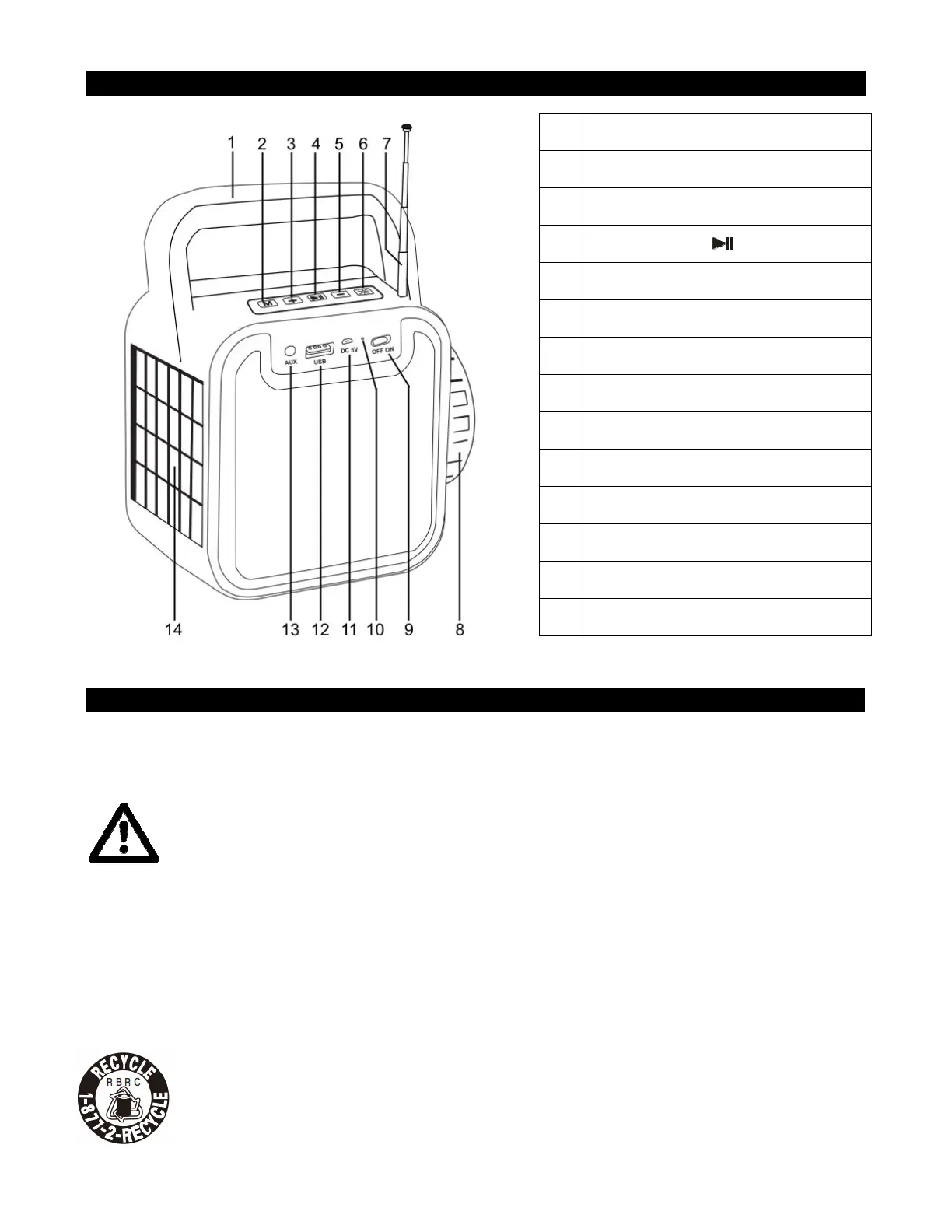 (#9) to turn on the unit. Tap the MODE BUTTON (#2) to select Bluetooth, FM, AUX or USB