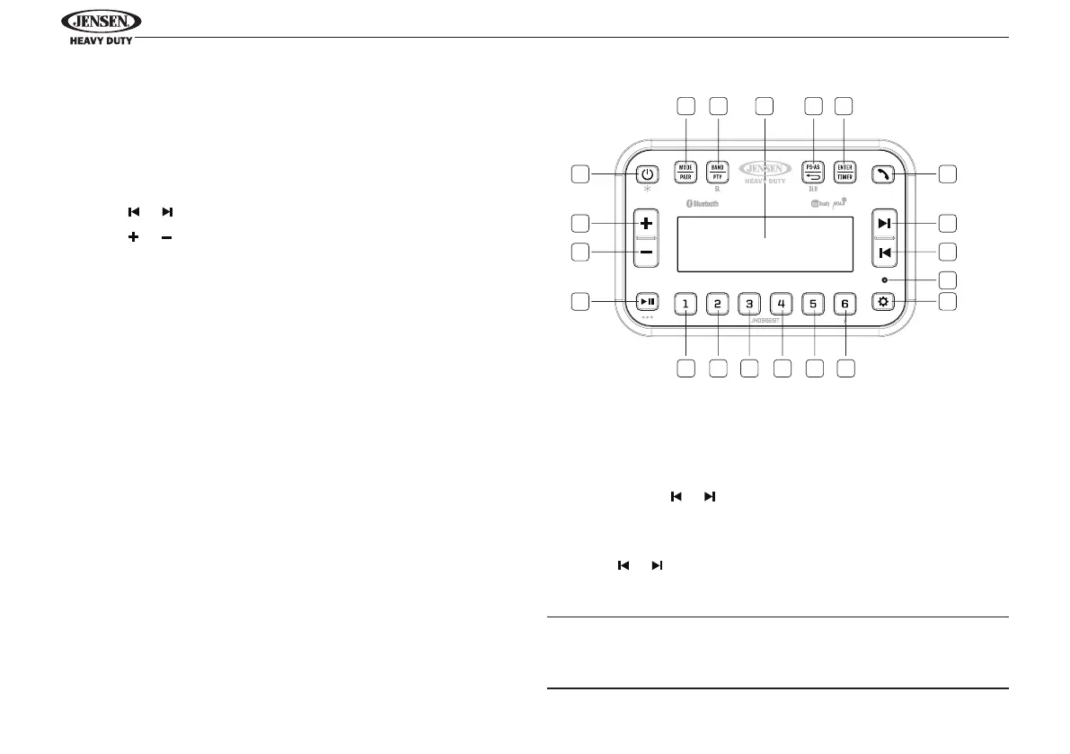 Press & hold the or buttons (9, 8) to seek stations up/