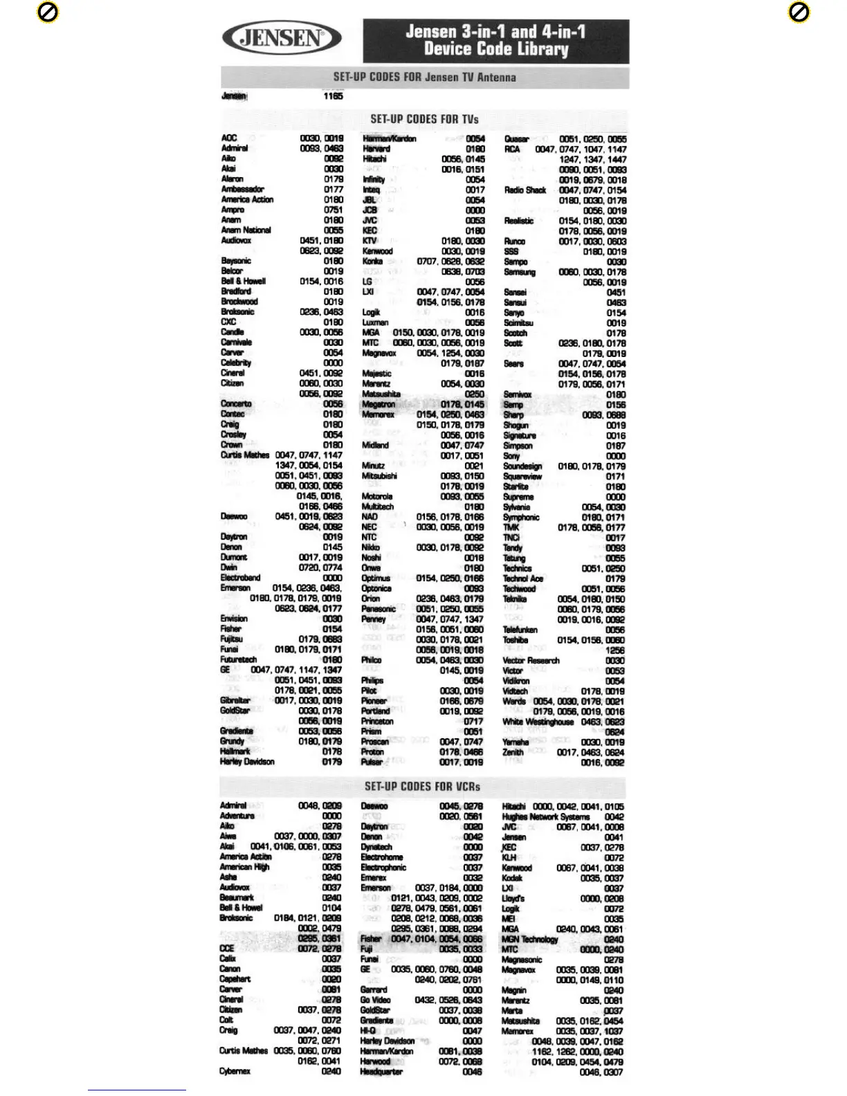 Jensen JR300 - Device Code Library for Remote Setup; Jensen TV Antenna Setup Codes; Television (TV) Setup Codes; VCR Setup Codes