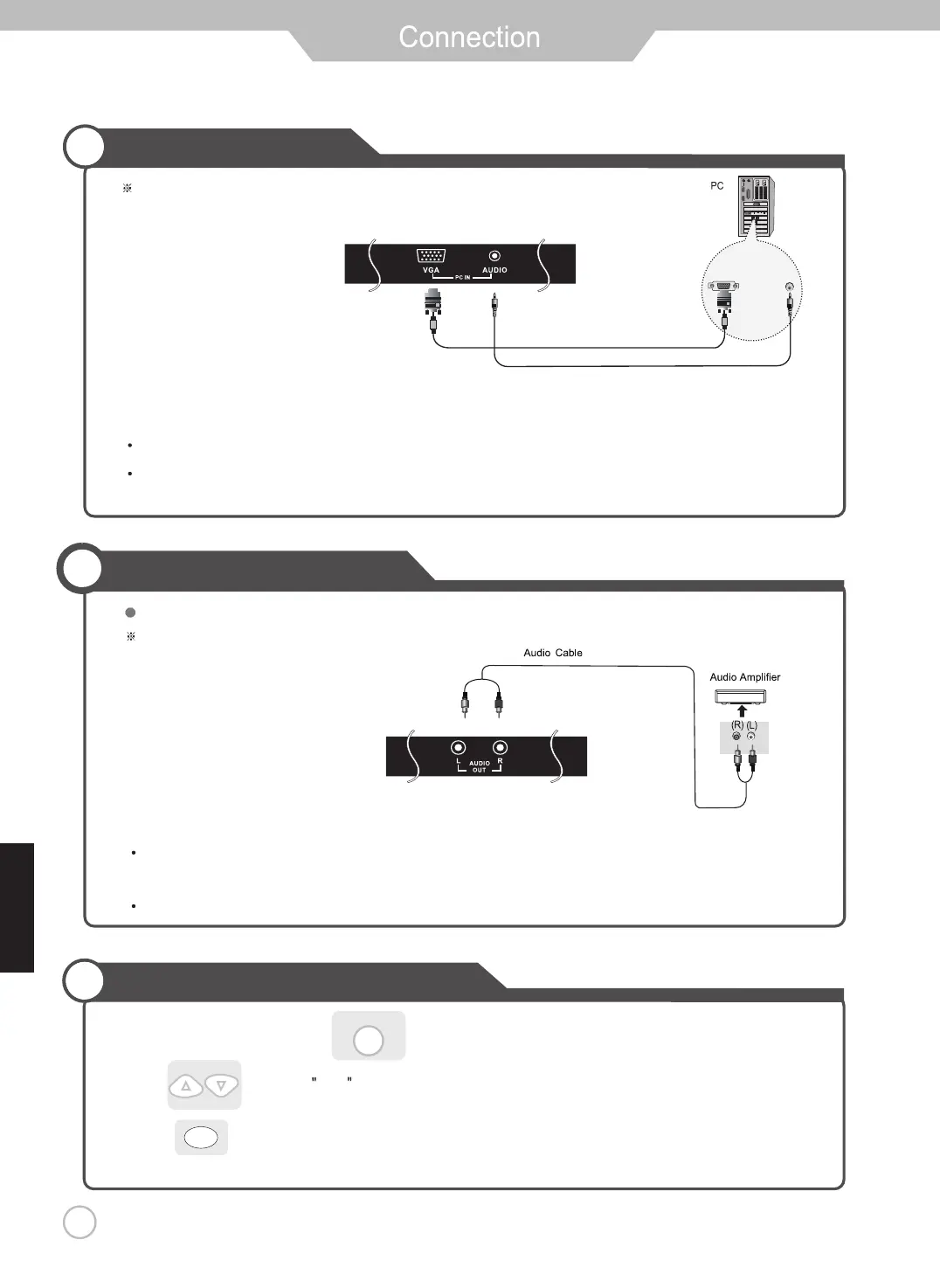 Connect the LED TV’s AUDIO (L/R) output terminal to Audio Amplifier using an audio patch cable.