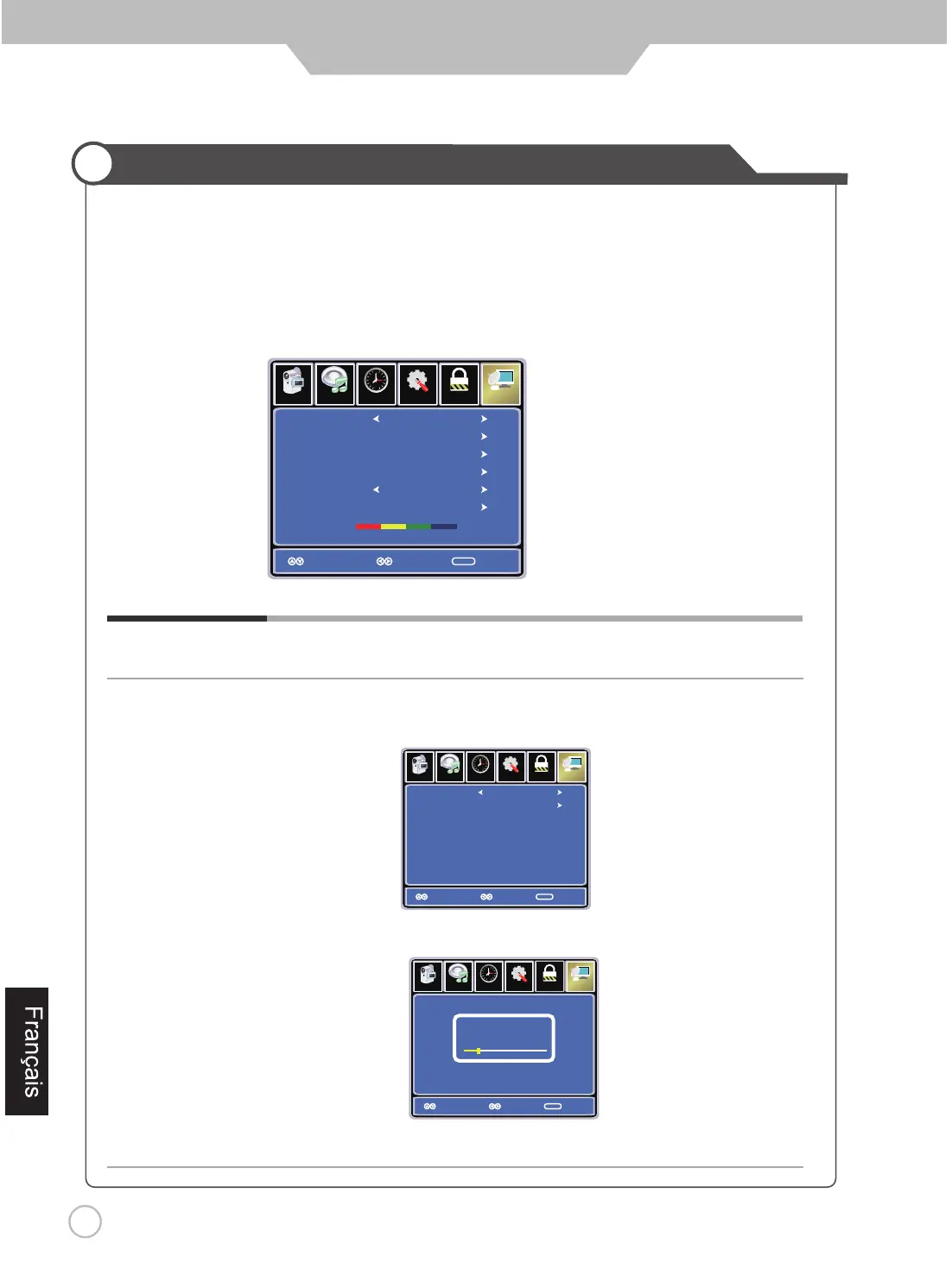 LEFT et RIGHT pour changer le paramétrage, et appuyer sur les boutons MENU ou EXIT pour quitter.