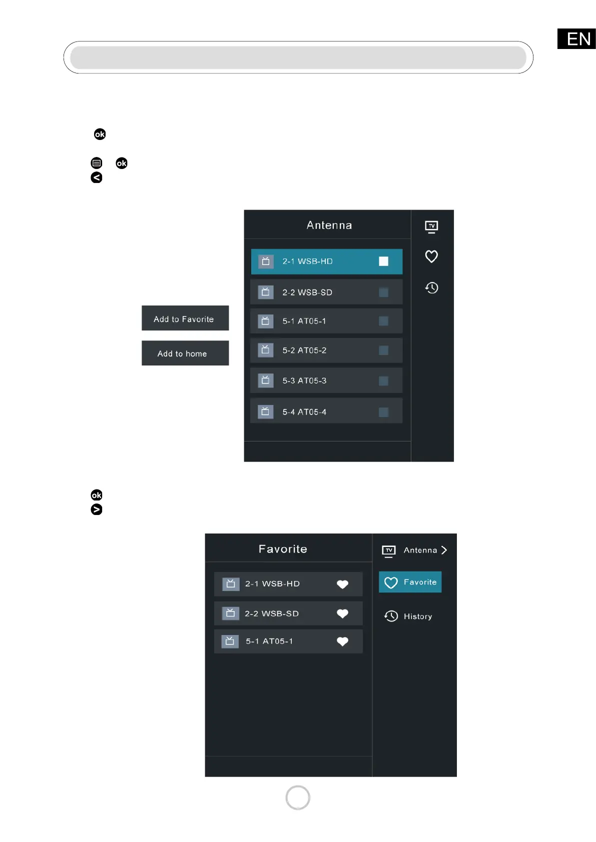 Press > Favorite, your favorite channel with a heart-shaped icon will appear on the