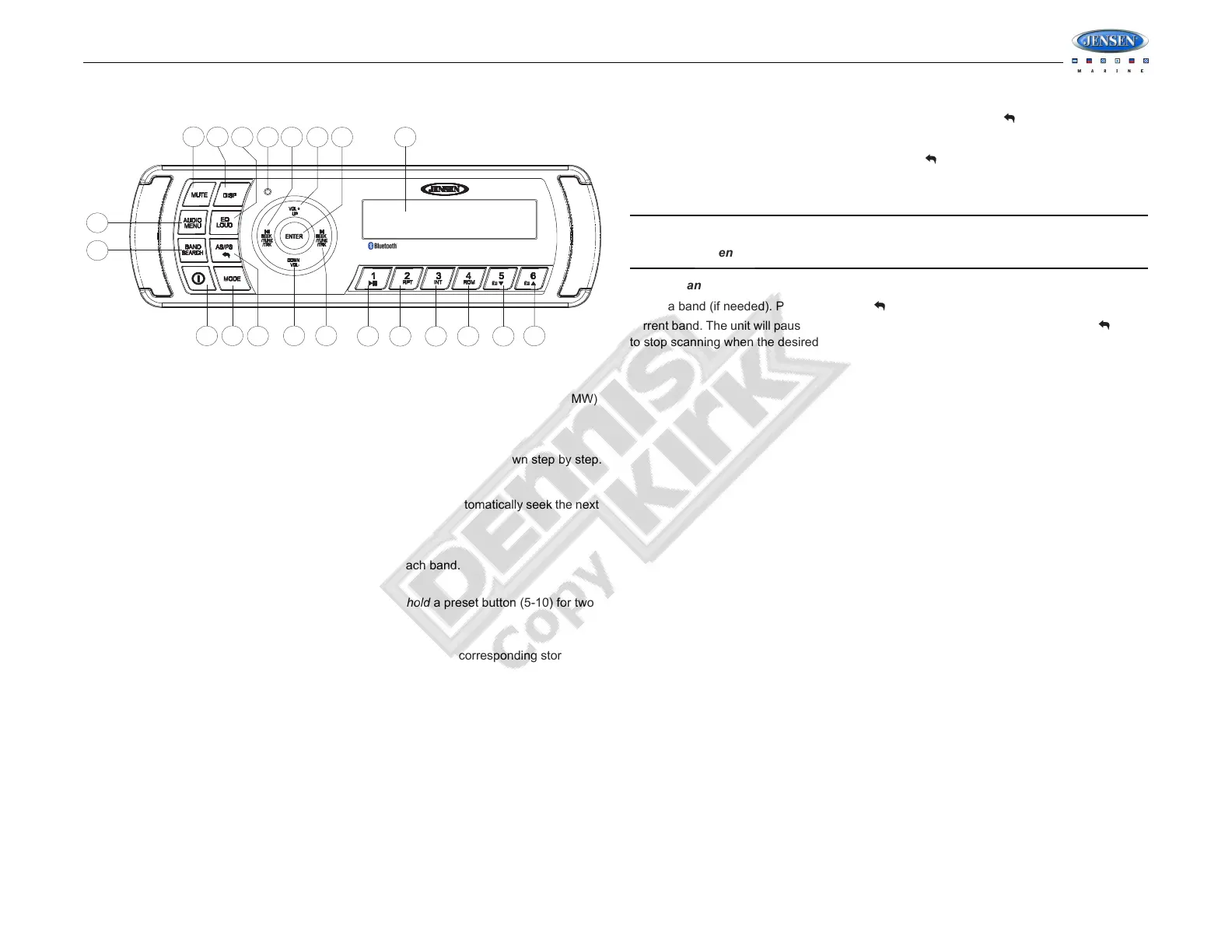 Six numbered preset buttons store and recall stations for each band.