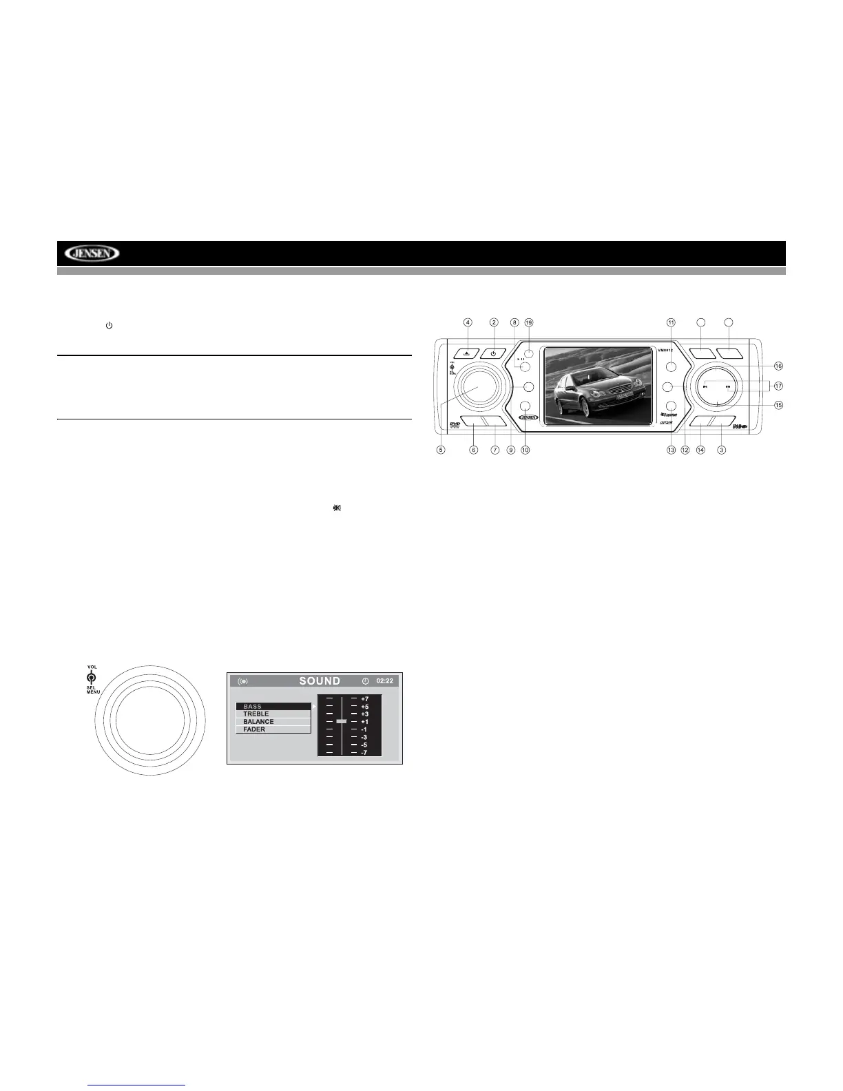Press the (power) button (2) to turn the unit on. Press and hold the power