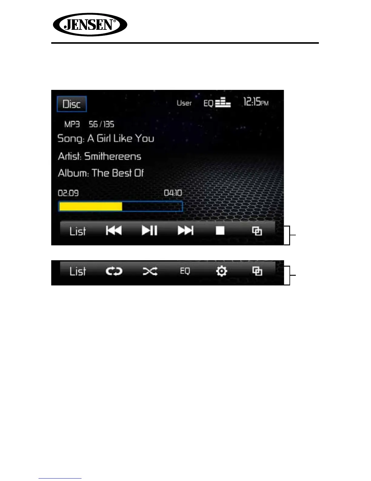 The on-screen indicators and touch key areas for MP3/WMA playback are outlined