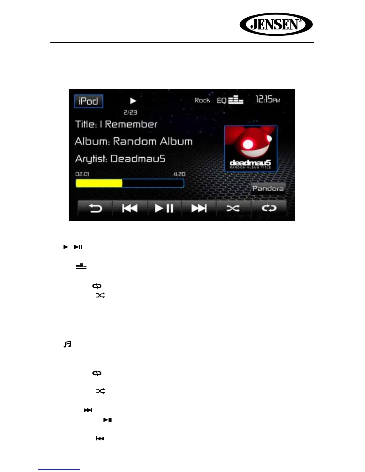15. Random ( ) icon: Touch to alter random mode as follows: Random On >