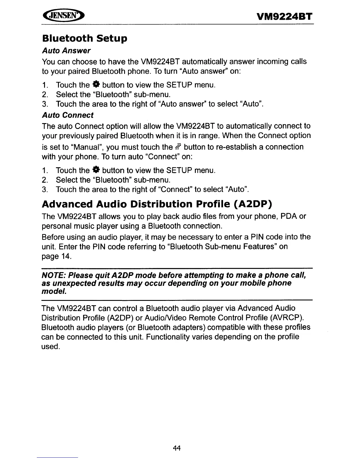 can choose to have the VM9224BT automatically answer incoming calls