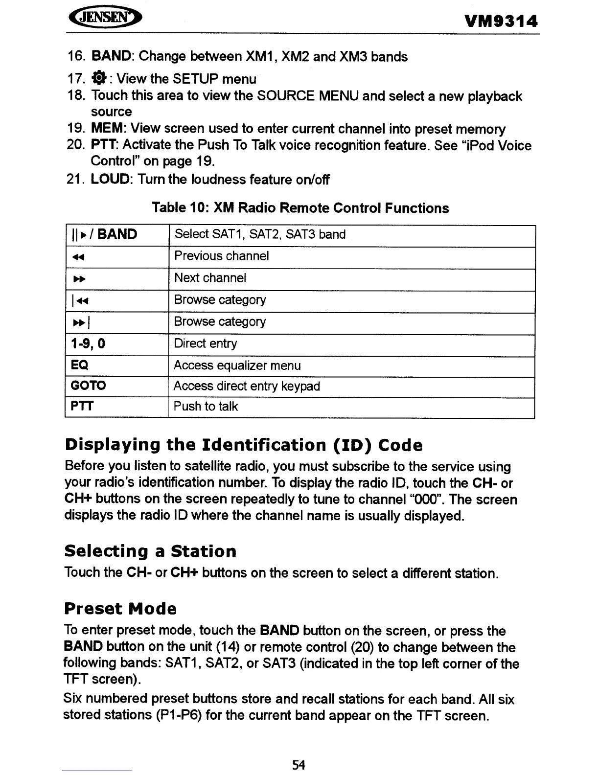 19. MEM: View screen used to enter current channel into preset memory