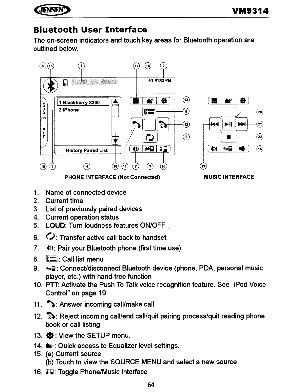 The on-screen indicators and touch key areas for Bluetooth operation are