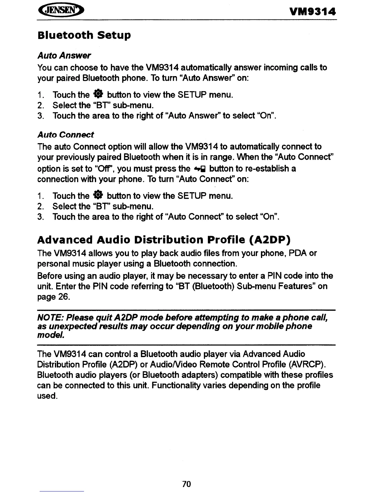 The VM9314 can control a Bluetooth audio player via Advanced Audio