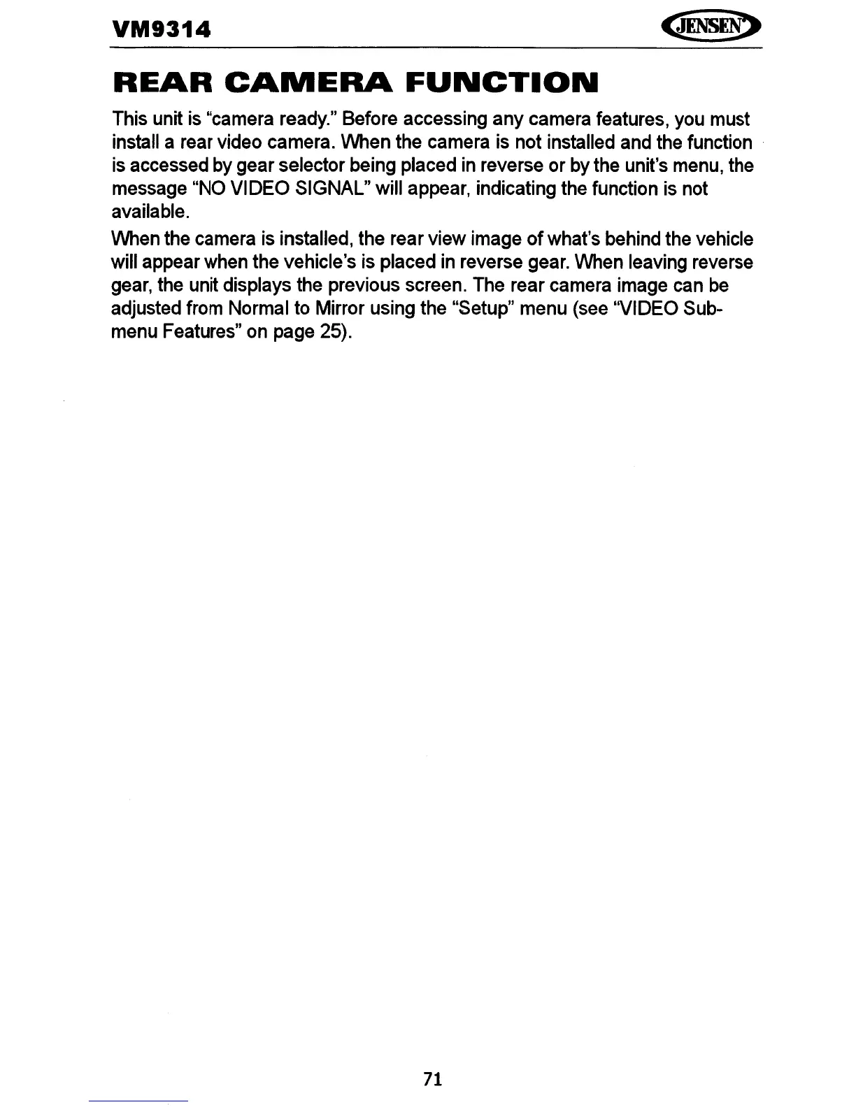 Jensen VM9314 - Rear Camera Function; Camera Integration and Display; Error Messages; Loading Error