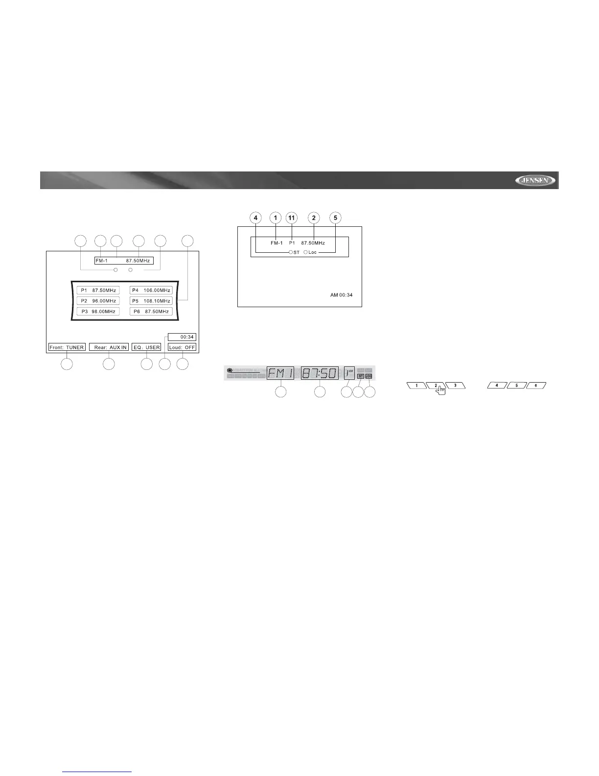 Seis botones numerados almacenan y sintonizan estaciones