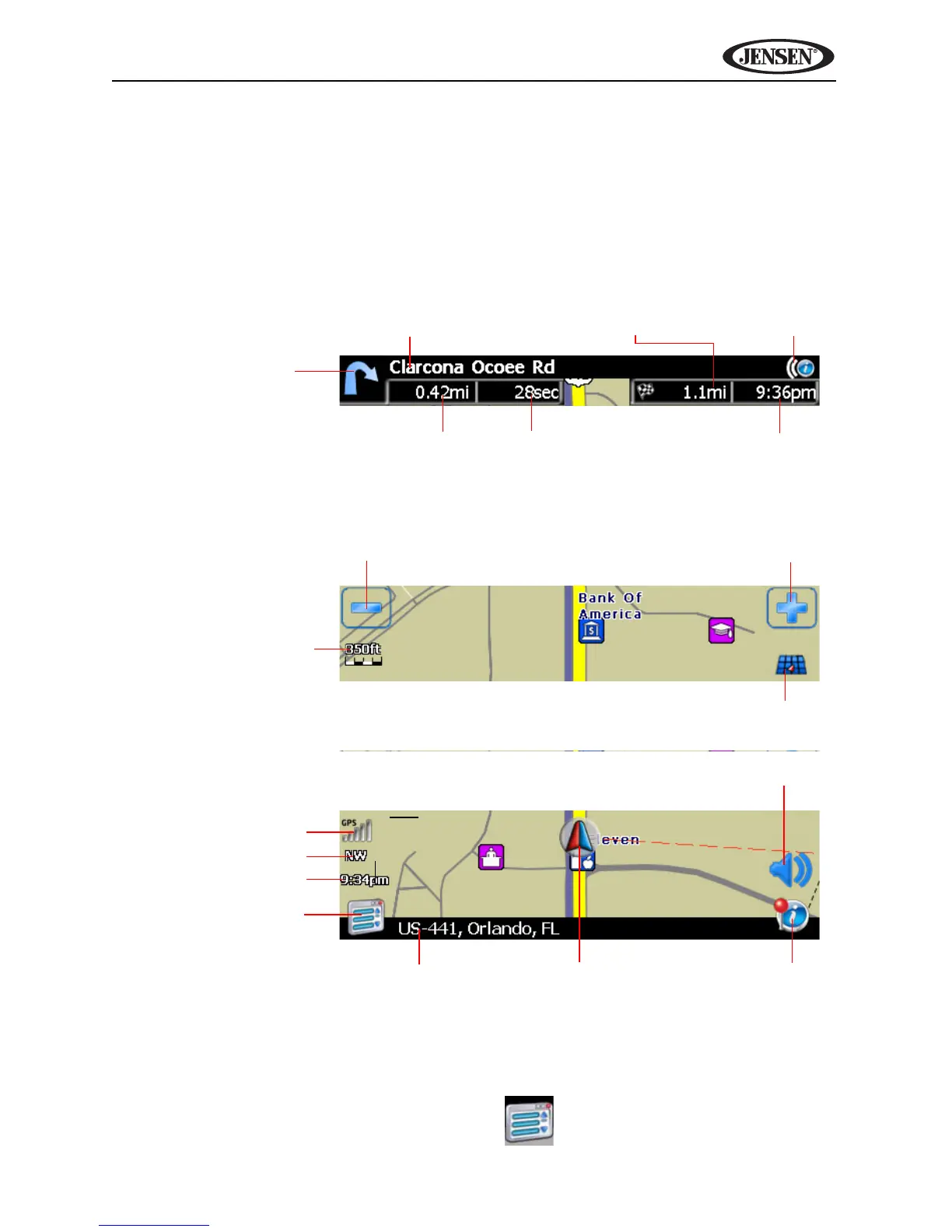 During navigation, the screen displays your route (in yellow) and your